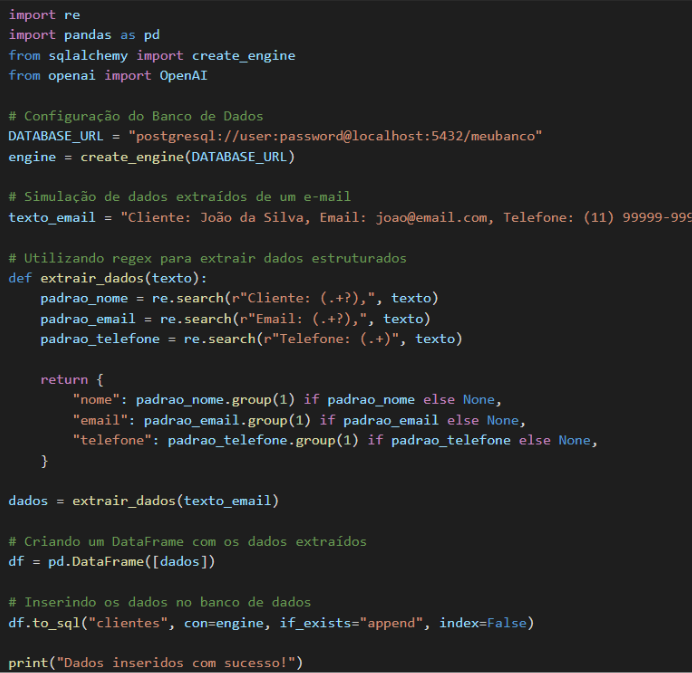 Vamos considerar um cenário em que uma empresa recebe dados de clientes de diversas fontes, como e-mails, documentos PDF e formulários online. Esses dados precisam ser extraídos, processados e armazenados corretamente em um banco de dados relacional.