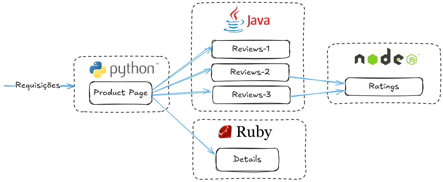 - productpage: O microsserviço productpage chama os microsserviços details e reviews para preencher a página.