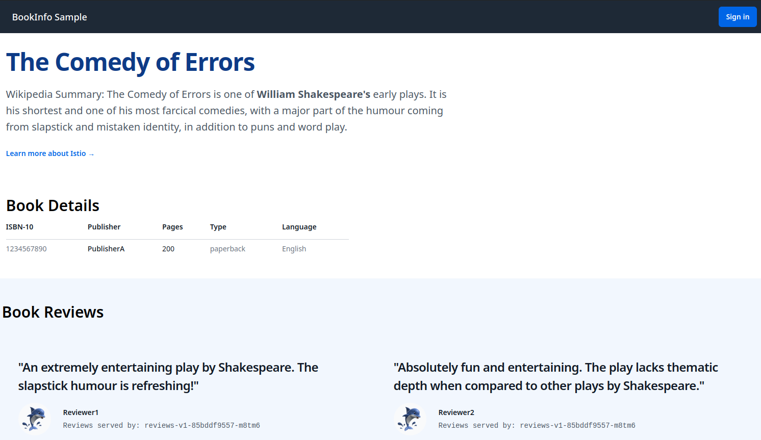O aplicativo Bookinfo é um aplicativo de exemplo composto por quatro microsserviços separados, utilizados para demonstrar vários recursos do Istio. A aplicação exibe informações sobre um livro, semelhante a uma entrada de catálogo de uma livraria online. A página mostra uma descrição do livro, detalhes (ISBN, número de páginas, etc.) e algumas avaliações. A estrutura do app é dividida em quatro microsserviços separados:
