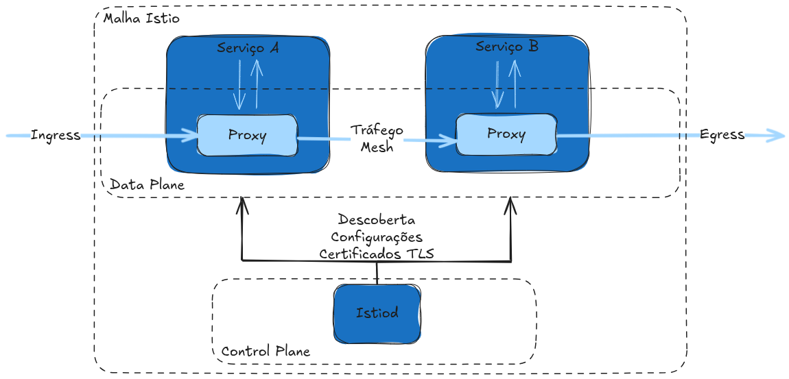 O Istio se utiliza de regras de firewall do Iptables e do proxy Envoy, outro projeto graduado da CNCF, para interceptar todo o tráfego de rede da malha, permitindo um amplo conjunto de recursos baseados em configurações previamente definidas. O plano de controle (control plane) recebe a configuração desejada, juntamente com sua visão dos serviços, e programa dinamicamente as instâncias de proxy Envoy no seu data plane, atualizando-os conforme as regras ou o ambiente mudam.