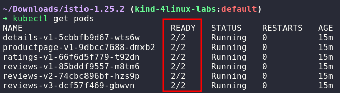 Como adicionamos uma Label no namespace que induz o Istio a monitorar os recursos e injetar os sidecars com o Envoy Proxy em todos os pods do namespace, já podemos observar que cada Pod do nosso novo Deployment possui 2 contêineres:
