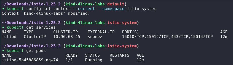 A instalação pode ser validada verificando o pod e o serviço do istiod no recém-criado namespace istio-system: