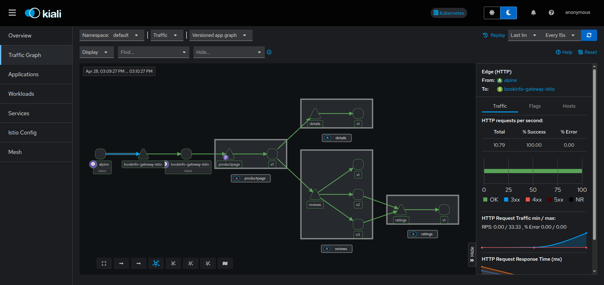 Agora basta acessarmos o gráfico de tráfego do Kiali para visualizarmos o gráfico das requisições que acabamos de gerar em nossa malha, incluindo, por exemplo, a visualização do serviço de reviews balanceando a carga entre os deployments reviews-V1, reviews-V2 e reviews-V3