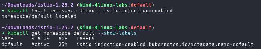 Para podermos realizar o deploy da nossa aplicação de testes, iremos adicionar ao namespace default do Kubernetes uma etiqueta (label) que irá instruir o Isto a injetar automaticamente o sidecar com o Envoy Proxy nos pods deste namespace através do comando: