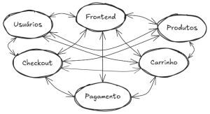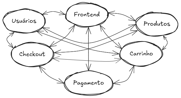 Na representação acima temos um exemplo de uma loja construída com arquitetura de microsserviços onde podemos imaginar que cada componente é desenvolvido com diferentes linguagens de programação e cada módulo conta com seu próprio repositório e esteira de CI/CD. Com base nesse esquema podemos, por exemplo, analisar a preocupação com a lógica de retry. Se o módulo do Checkout não conseguir uma resposta do módulo de Pagamentos, em quanto tempo ele deverá aguardar por uma resposta? Em quanto tempo ele deverá tentar novamente? Qual a configuração ideal de tentativas para evitar uma sobrecarga no sistema e na rede?