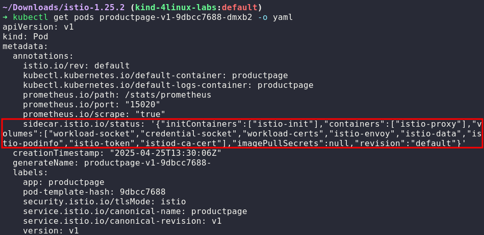 Uma olhada mais de perto nas anotações do pod productpage-v1-9dbcc7688-dmxb2 também pode nos evidenciar que o Istio já entrou em ação: