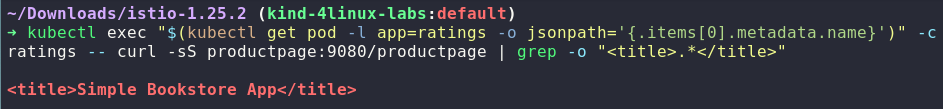 kubectl exec "$(kubectl get pod -l app=ratings -o jsonpath='{.items[0].metadata.name}')" -c ratings -- curl -sS productpage:9080/productpage | grep -o "<title>.*</title>"